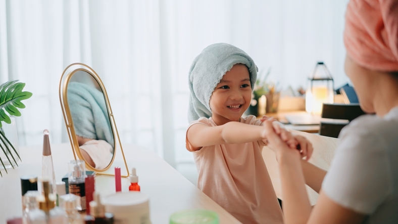 In Singapore’s warm weather, it is tempting to bathe your child often. However, long, hot showers can dry out the skin. Keep baths short, around 5–10 minutes and use lukewarm water with a mild, soap-free cleanser. Gently pat the skin dry with a soft towel instead of rubbing.